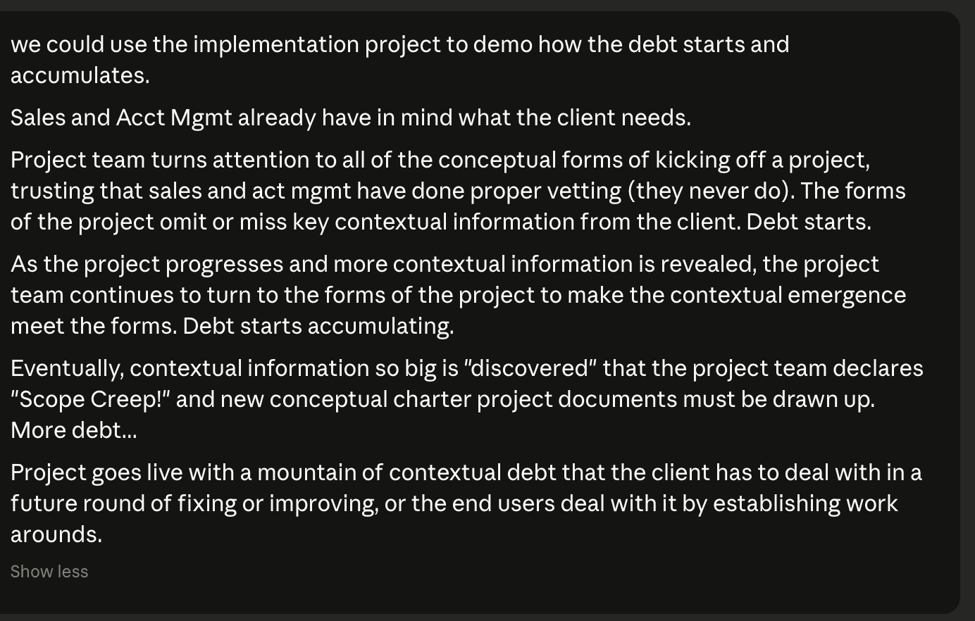 Debt deepens: Each piece of contextual information gets forced into conceptual project framework rather than allowing the work to respond to what’s actually needed